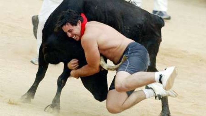 V Pamploně se býci znovu rozeběhli ulicemi, aby místním mladíkům pozvedli adrenalin. Jeden z nich právě na vlastní kůži zažívá, jak umí býči rohy lechtat.