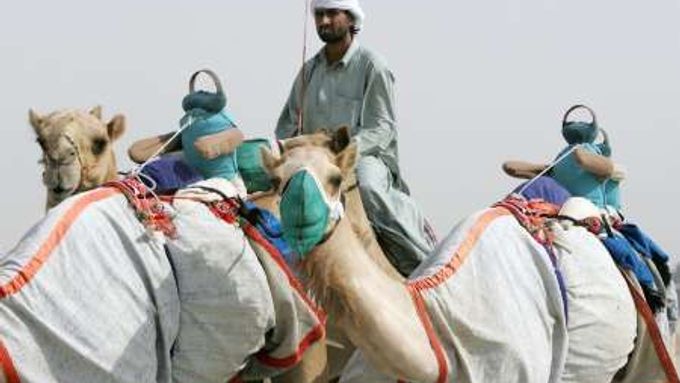 Roboti, kteří ve velbloudích dostizích nahrazují týrané dětské žokeje, si se svým trenérem vyjeli na trénink nedaleko Dubaje.